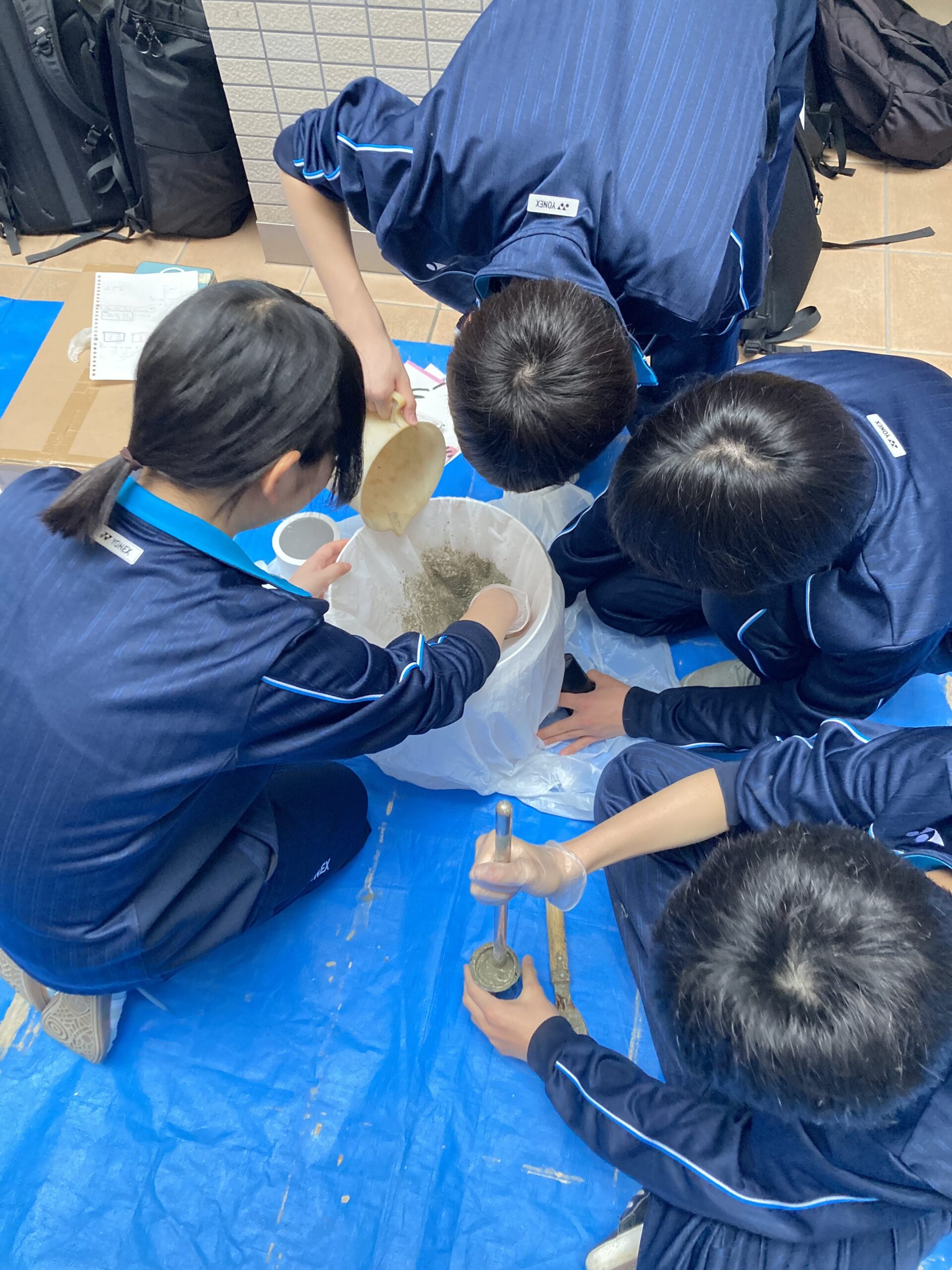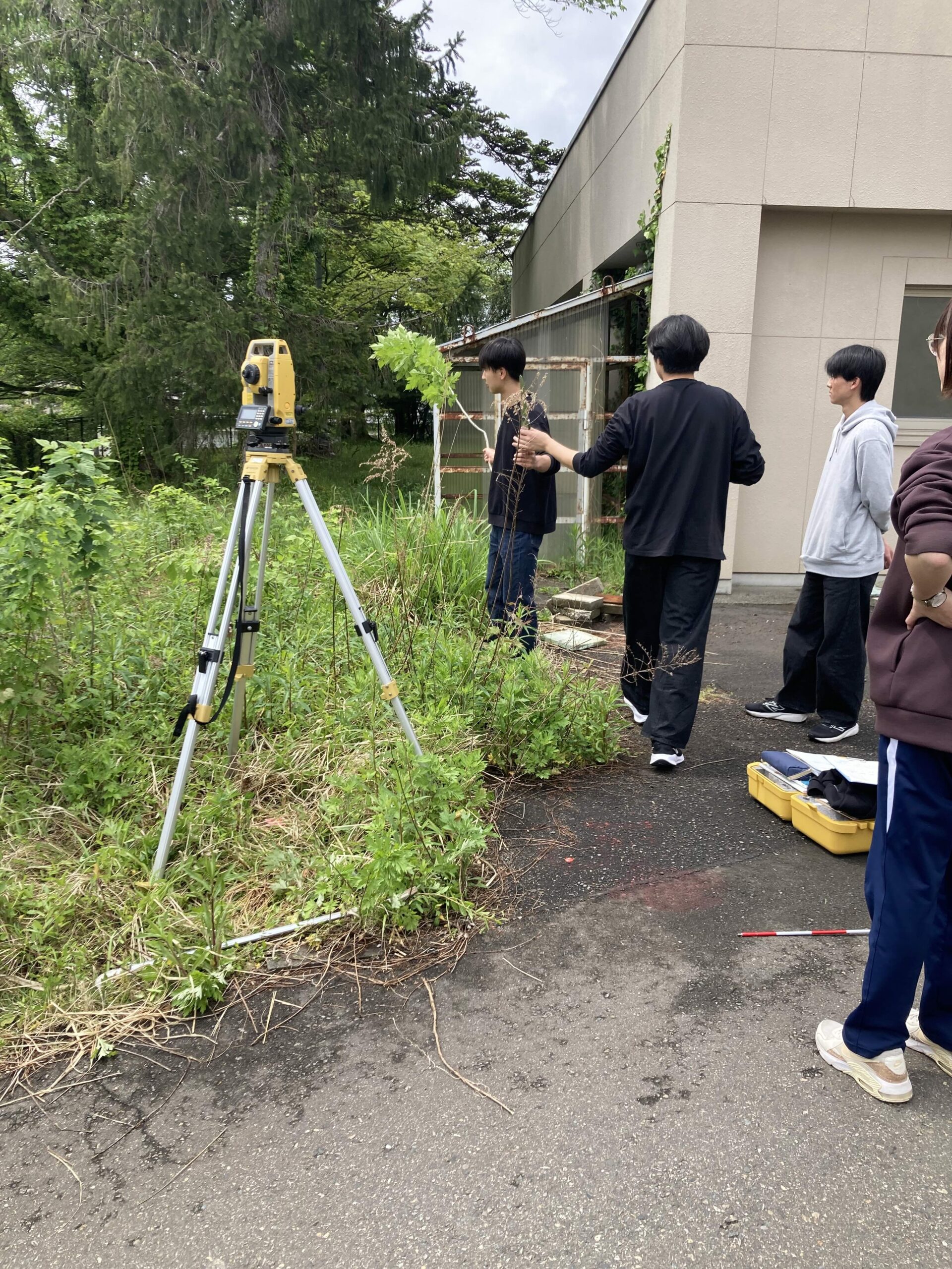 ![]() 1年生がコンクリートを作っています. | ![]() 測量の実習をしています. 建物やポイントの座標を計算します. |