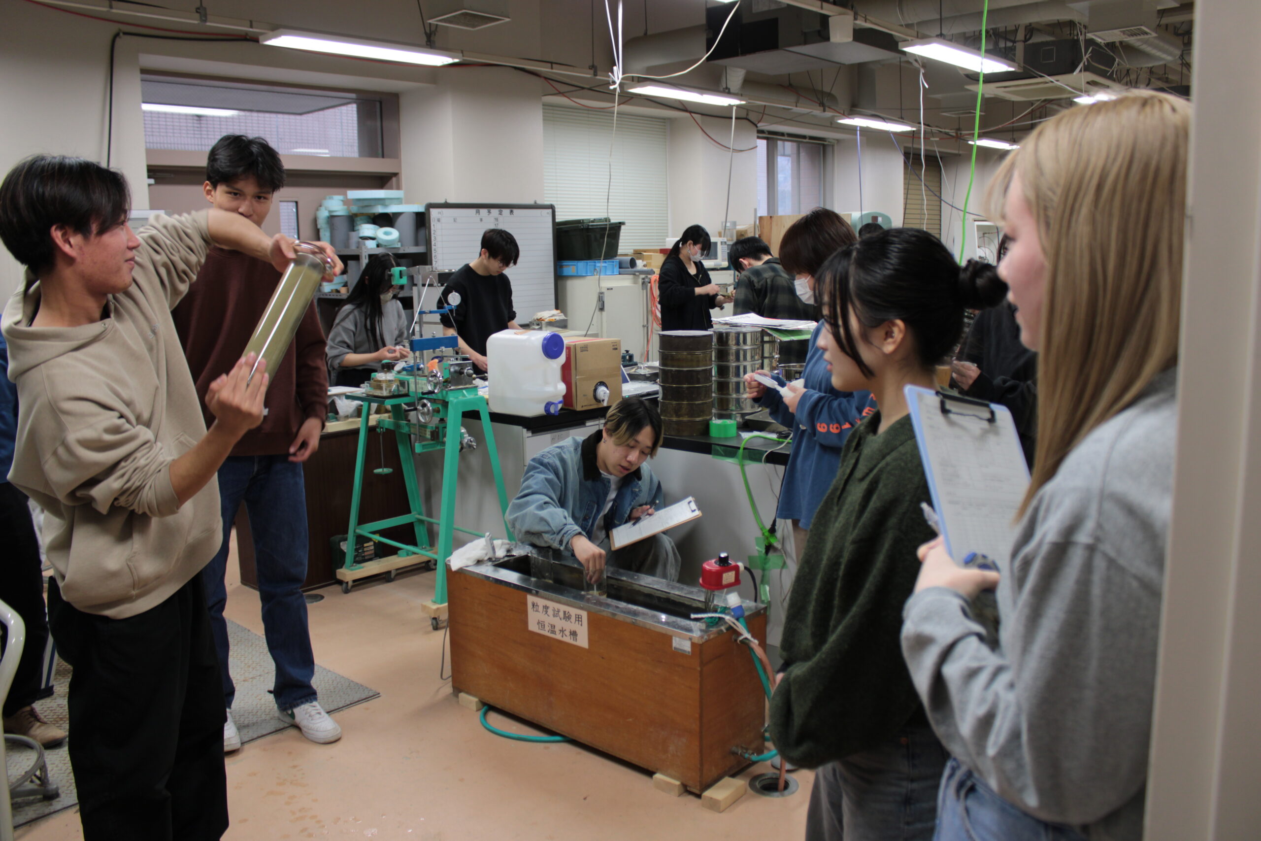 ![]() 土に関する実験を行っています. 他にも水や材料など様々な実験を行います. | ![]() 土木・建設・環境分野の様々な研究室があります. 専攻科生にも指導してもらうことができます. |